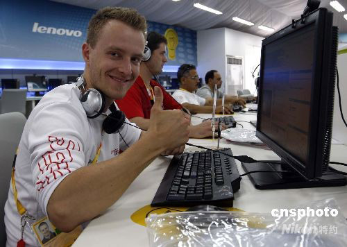 7月29日,一名在北京奧運村網吧上網的外國運動員,豎起大拇指贊揚這里的設施和服務。奧運村網吧從早上8 點開始開放至午夜12點,所有居住在奧運村中的運動員、教練員和官員,均可憑有效證件進入網吧免費享受上網服務。 中新社發(fā) 杜洋 攝