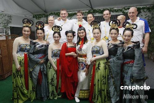 圖為英國(guó)跳水隊(duì)和奧運(yùn)村茶館里的演員一起合影。 中新社發(fā) 杜洋 攝