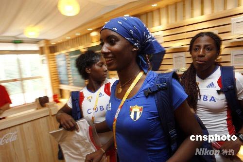 7月29日,來(lái)自古巴的女運(yùn)動(dòng)員在北京奧運(yùn)村的紀(jì)念章交換中心參觀。中新社發(fā) 杜洋 攝