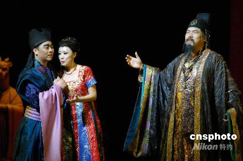 7月30日晚,由享譽(yù)國際的中國作曲家譚盾創(chuàng)作的歌劇《茶——心靈的明鏡》首度登上北京的國家大劇院。該劇通過追述中國茶文化的起源與陸羽的《茶經(jīng)》,引出唐朝公主與日本王子圣響的一段愛情,其音樂具有中國式的深遠(yuǎn)和淡定,同時(shí)運(yùn)用諸多自然聲響,融入水琴、云鑼、瓷器、陶鼓、紙、水等打擊樂器,與整部歌劇表現(xiàn)的茶經(jīng)、禪道在形式及內(nèi)容上渾然一體。圖為公主與日本王子的愛情受到皇帝恩準(zhǔn)。中新社發(fā) 潘旭臨 攝