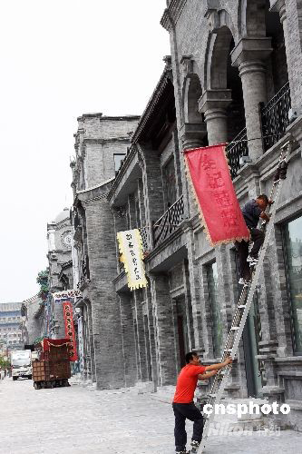圖:北京前門大街張掛牌匾準(zhǔn)備開街