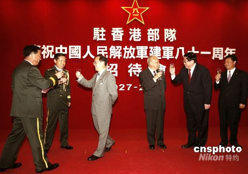 七月三十一日晚,為慶祝中國人民解放軍建軍八十一周年,并感謝特區(qū)政府和香港社會各界長期以來對駐軍的關(guān)心與支持,駐港部隊(duì)在中環(huán)軍營舉辦了“駐香港部隊(duì)?wèi)c祝中國人民解放八十一周年招待會”。全國政協(xié)副主席董建華、香港特區(qū)行政長官曾蔭權(quán)、中聯(lián)辦主任高祀任、外交部駐港特派員呂新華、駐港部隊(duì)司令員張少波少將、政治委員劉良凱中將等出席了此次招待會。中新社發(fā) 張勤 攝