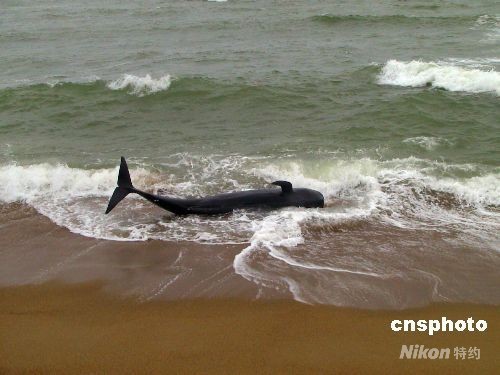 2008年8月7日,一只鯨魚擱淺博鰲玉帶灘。這張由海南博鰲邊防派出所提供的照片顯示,當(dāng)天上午八時許,這只長約2米,重1000多斤不明種類的鯨魚擱淺博鰲玉帶灘,離出海口約200米遠的海灘邊,邊防派出所和瓊海漁政部門接報后立即派員前往救助。同在博鰲萬泉河出海口,2005年5月2日,一只重約300多斤的鯨魚受傷擱淺岸邊,經(jīng)搶救無效死亡。當(dāng)?shù)貪O民認為,鯨魚擱淺常與大風(fēng)暴有關(guān)。中新社發(fā) 蒙鐘德 攝