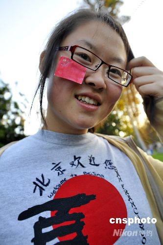 圖為剛到美國2年的高一女生自己制作了國旗貼紙和“北京歡迎你”字樣的T恤衫觀看北京奧運開幕式轉播。中新社發(fā) 陳鋼 攝