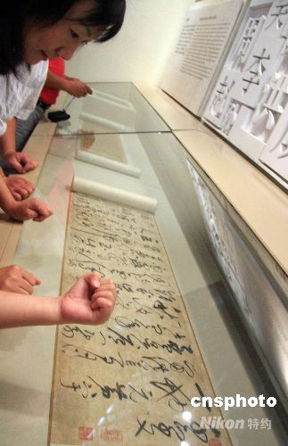 8月11日,觀眾在中國科技館新館內(nèi)仔細(xì)欣賞中國古代一位皇帝——宋徽宗趙佶的書法作品真跡。趙佶雖然皇帝做得不怎么樣,卻以獨創(chuàng)的“瘦金體”書法和高超的工筆繪畫藝術(shù),為中國書畫藝術(shù)發(fā)展作出重要貢獻(xiàn)。中新社發(fā) 孫自法 攝