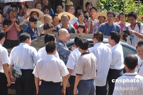 八月十四日下午,中國國民黨主席吳伯雄在福建永定縣的高北土樓群參觀完后,上車前與鄉(xiāng)親話別,隨后乘車趕赴廈門。中新社發(fā) 鄭祚聲 攝