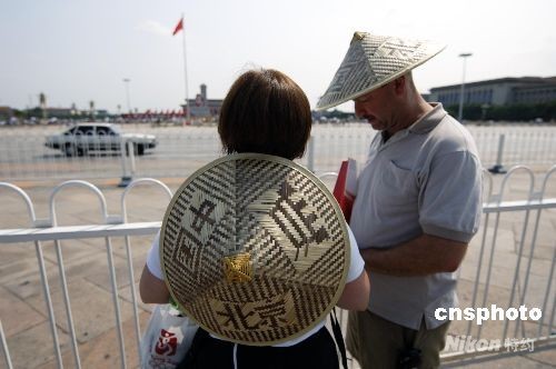 8月18日,北京天氣晴好,外國游客頭戴斗笠游北京。中新社發(fā) 王東明 攝