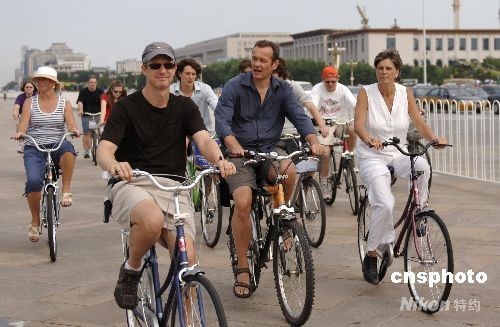 8月18日,北京晴空萬里,外國游客集體騎自行車在北京街頭游玩。中新社發(fā) 王東明 攝