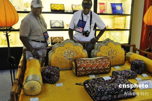 8月21日,北京故宮博物院的“皇家飾品”商店迎來了海內(nèi)外顧客。商店內(nèi)銷售的均為仿清朝宮廷風(fēng)格的各式靠墊、睡衣等絲綢錦緞手工制品。美國游客安東尼和查里對(duì)商店里清代皇家風(fēng)格的刺繡紋飾擺件情有獨(dú)鐘。中新社發(fā) 王宇婷 攝