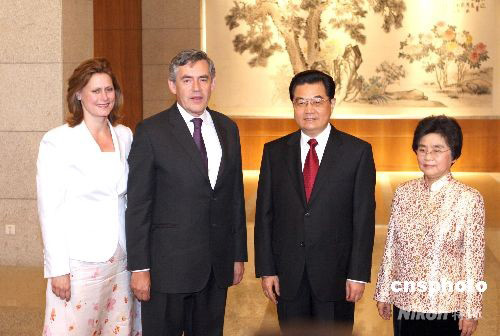 胡錦濤夫婦歡迎出席奧運(yùn)閉幕式的英國(guó)首相布朗夫婦