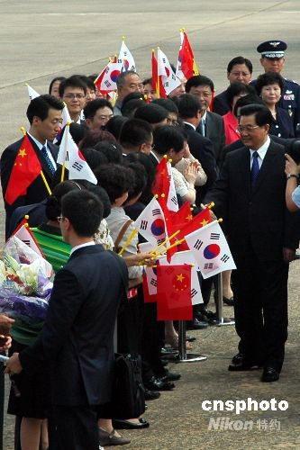 八月二十五日中午,中國國家主席胡錦濤抵達韓國首都首爾,開始對韓國進行為期兩天的國事訪問。中新社發(fā) 孫宇挺 攝