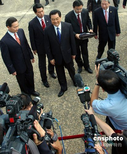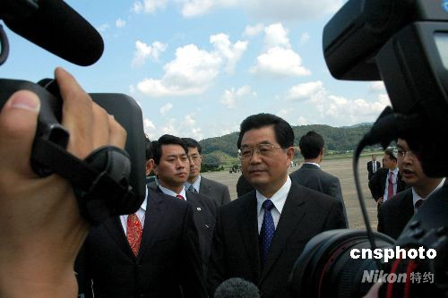 中國國家主席胡錦濤八月二十五日中午抵達韓國首都首爾,胡錦濤在機場對記者發(fā)表講話。