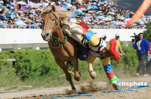 9月1日,2008中國拉薩雪頓節(jié)馬術(shù)表演和賽牦牛在拉薩賽馬場舉行。馬術(shù)表演和賽牦牛是藏民族傳統(tǒng)體育競技比賽,當(dāng)日來自拉薩市縣區(qū)的幾支隊伍進行了精彩的騎馬射擊、馬術(shù)表演、拾哈達及賽牦牛活動,吸引了成千上萬的游客和市民前來觀看。中新社發(fā) 周波 攝