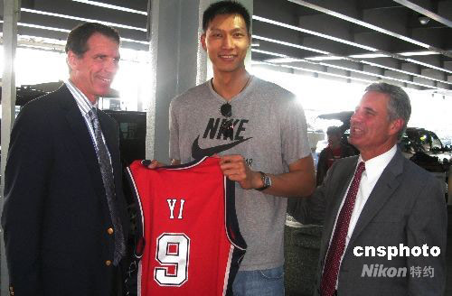當(dāng)?shù)貢r(shí)間9月8日下午,本賽季將代表新澤西網(wǎng)隊(duì)征戰(zhàn)NBA的中國(guó)球員易建聯(lián)抵達(dá)紐約肯尼迪機(jī)場(chǎng)。他將在一周后參加網(wǎng)隊(duì)“新秀訓(xùn)練營(yíng)”,為新賽季做準(zhǔn)備。網(wǎng)隊(duì)總經(jīng)理奇奇·范德維奇(左)和執(zhí)行副主席里奧·埃爾萊(右)帶著易建聯(lián)的新球衣到機(jī)場(chǎng)迎接。中新社發(fā) 李靜 攝