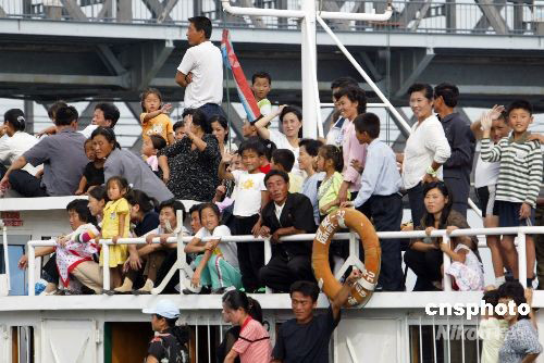 9月9日正值朝鮮國(guó)慶,朝鮮新義洲民眾有組織地乘船游覽鴨綠江。中新社發(fā) 陳浩浩 攝