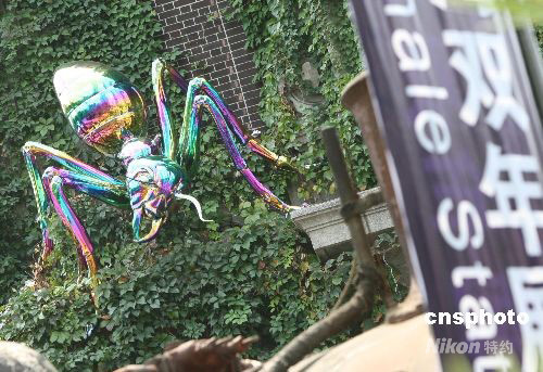 9月9日,一只巨型“螞蟻”爬上了上海美術(shù)館的鐘樓,引起了不少路人的好奇。 這只“螞蟻”是藝術(shù)家陳志光參加2008上海雙年展的作品,他以“螞蟻搬家”來演繹本屆雙年展有關(guān)城鄉(xiāng)移民的主題。中新社發(fā) 湯彥俊 攝