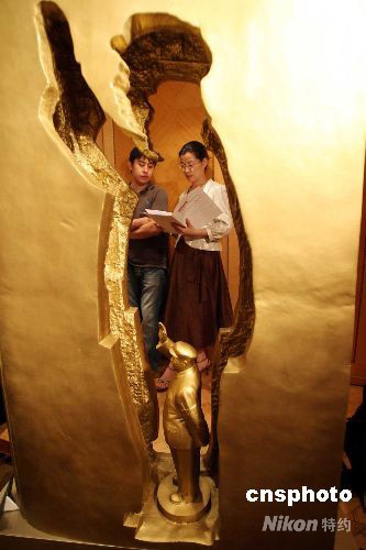 九月十日,香港國(guó)際藝展公司向傳媒展示雕塑家任思鴻的銅雕塑“空像”。該公司主辦的 “2008香港國(guó)際古玩及藝術(shù)品博覽會(huì)”將在十月四日至七日在會(huì)展中心舉行。中新社發(fā) 洪少葵 攝