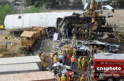當?shù)貢r間九月十三日上午,救援人員在嚴重受損的列車車廂里搜尋遇難者遺體。十二日下午,距離洛杉磯市中心四十公里的近郊發(fā)生一起客運通勤列車與貨運列車相撞的嚴重事故,至少造成26人死亡,130多人受傷。中新社發(fā) 張煒 攝