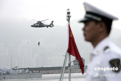 圖為駐港部隊槍械團(tuán)體操表演。中新社發(fā) 張勤 攝