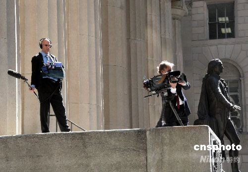 華爾街連日來大事連連,成為全世界媒體關(guān)注的新聞熱點。9月19日,多家媒體守候在紐約證券交易所門外,隨時準(zhǔn)備播報華爾街第一手動態(tài)。中新社發(fā) 魏晞 攝