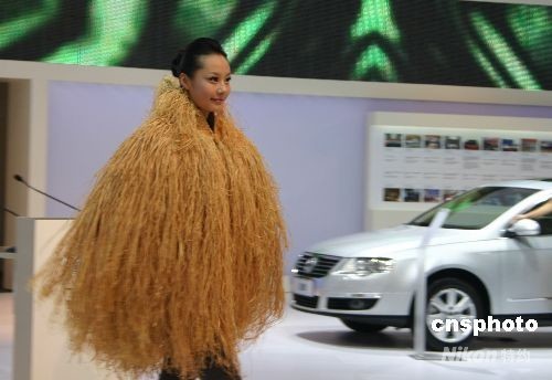 第11屆成都國際車展向媒體開放,一美女車模著“稻草”裝現(xiàn)身。 中新社發(fā) 霍潺 攝