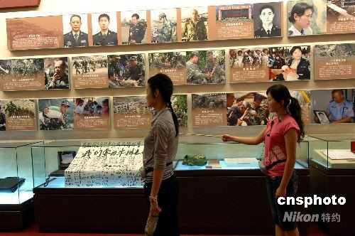 9月20日上午,中國(guó)人民革命軍事博物館青年講解員正在為“‘萬(wàn)眾一心 眾志成城’--抗震救災(zāi)主題展覽”欄目背誦講解詞。由中共中央宣傳部、國(guó)家發(fā)展和改革委員會(huì)、解放軍總政治部共同主辦的此項(xiàng)展覽,將于9月21日正式對(duì)公眾開放。該展覽為汶川大地震后,北京舉辦的反映抗震救災(zāi)工作,規(guī)模最大,文物最多,圖片形象最為詳盡的展覽之一。中新社發(fā) 鄒憲 攝