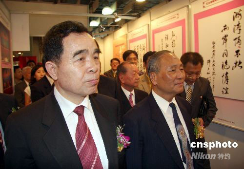 9月20日,紀(jì)念海峽兩岸出版交流二十周年圖片展在臺北世貿(mào)中心三館開幕。圖為參加活動的大陸參訪團(tuán)團(tuán)長、紀(jì)念海峽兩岸出版交流二十周年系列活動組委會名譽(yù)主任柳斌杰(左一),紀(jì)念海峽兩岸出版交流二十周年系列活動組委會主任委員陳恩泉(左二)等參觀圖片展。中新社發(fā) 陳立宇 攝