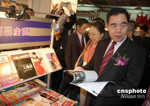 9月20日,第四屆海峽兩岸圖書交易會(huì)在臺(tái)北世貿(mào)中心三館開幕,中新社主辦的《中國(guó)新聞周刊》現(xiàn)身第四屆海峽兩岸圖書交易會(huì)。圖為大陸參訪團(tuán)團(tuán)長(zhǎng)、新聞出版署署長(zhǎng)柳斌杰參觀大陸期刊綜合展區(qū)時(shí),觀看《中國(guó)新聞周刊》。中新社發(fā) 陳立宇 攝