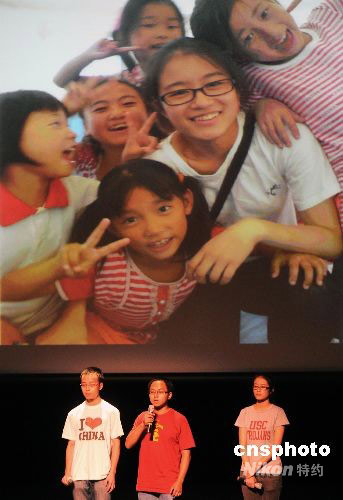 當(dāng)?shù)貢r(shí)間9月20日晚,來(lái)自美國(guó)西南各地的數(shù)百名中國(guó)留學(xué)生和學(xué)者代表在洛杉磯南加州大學(xué)歡聚一堂,舉行“夢(mèng)圓中華”中秋國(guó)慶晚會(huì),迎接中華人民共和國(guó)成立59周年。圖為留學(xué)生代表在晚會(huì)上講述暑期赴四川地震災(zāi)區(qū)從事志愿活動(dòng)的經(jīng)歷。中新社發(fā) 張煒 攝