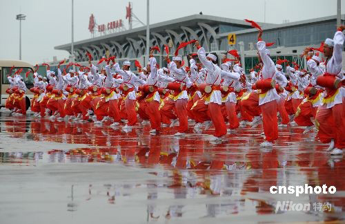 圖:寧夏回族青年舞動(dòng)腰鼓歡迎中央代表團(tuán)抵達(dá)