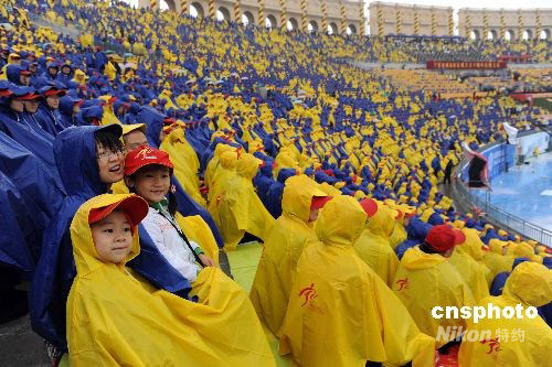 9月23日上午,寧夏回族自治區(qū)成立50周年慶祝大會在銀川市覽山景觀劇場舉行,民眾穿著雨衣參加大會。中新社發(fā) 廖攀 攝