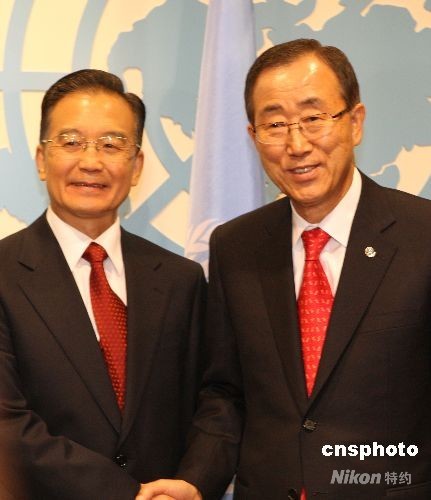 9月23日晚,中國(guó)總理溫家寶在紐約聯(lián)合國(guó)總部與聯(lián)合國(guó)秘書長(zhǎng)潘基文舉行會(huì)晤。中新社發(fā) 李靜 攝