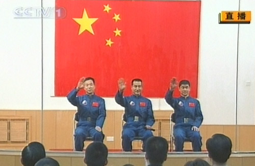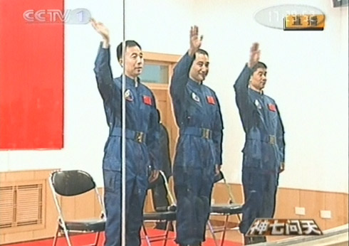 翟志剛(中)、劉伯明(右)、景海鵬組成飛行乘組執(zhí)行“神舟七號”載人航天飛行任務。(央視截圖)