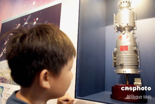 九月二十四日,一位小朋友被“神舟七號——中國首次太空漫步”展上的神舟太空船宣傳畫所吸引。當(dāng)日起,香港太空館舉行相關(guān)展覽,讓市民加深對神舟七號、以及中國載人航天科技發(fā)展的認(rèn)識。中新社發(fā) 張勤 攝