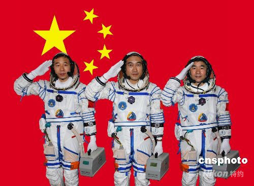 執(zhí)行神舟七號(hào)載人航天飛行任務(wù)的航天員翟志剛(中)劉伯明(右)景海鵬(左)向祖國(guó)和人民致以莊嚴(yán)的軍禮。中新社發(fā) 秦憲安 攝