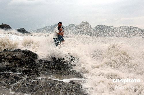 9月28日,受超強(qiáng)臺風(fēng)“薔薇”影響,浙江溫州市洞頭島海域已是波濤洶涌,海礁上掀起的巨浪高達(dá)10多米。下午2時許,一對外地父女在海邊游玩時不慎被突漲的潮水困在礁石上,隨時可能被海浪吞噬。正在海邊巡邏的洞頭邊防大隊官兵發(fā)現(xiàn)險情后,迅速展開緊急營救,成功將父女從海浪中安全救上岸。中新社發(fā) 吳水斌 攝