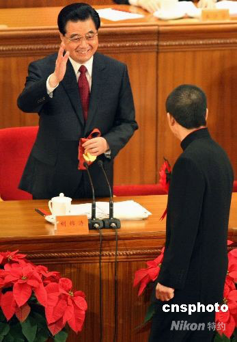 國(guó)家主席胡錦濤向獲獎(jiǎng)單位和個(gè)人頒獎(jiǎng)時(shí),向獲獎(jiǎng)的張藝謀表示祝賀。