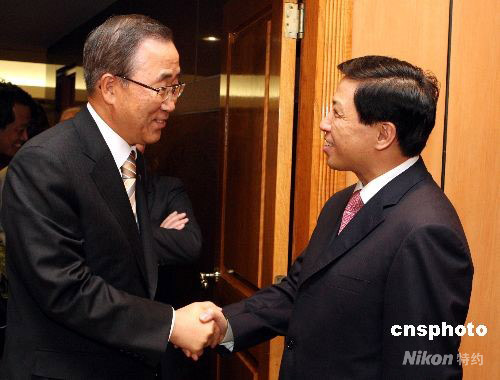 中國常駐聯(lián)合國代表團29日晚舉辦中國國慶59周年招待會,聯(lián)合國秘書長潘基文出席。圖為中國新任常駐聯(lián)合國代表張業(yè)遂歡迎潘基文出席招待會。中新社發(fā) 李靜 攝