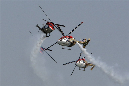 印度空軍為慶祝建軍76周年舉行印度航空展。圖為10月8日,印度空軍“孔雀”(Sarang)直升機(jī)特技飛行隊(duì)在欣登(Hindon)空軍基地進(jìn)行表演。