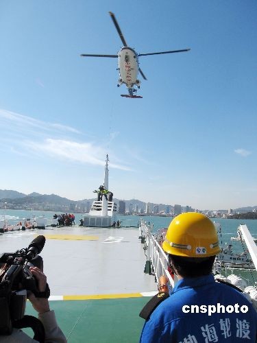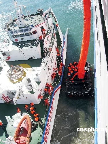 圖為客滾船釋放海上救生撤離系統(tǒng),通過兩條高20多米直通海面的垂直救生滑道快速將受困旅客轉(zhuǎn)移到前來救援的船上。