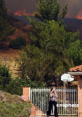山林大火正逼近洛杉磯近郊的民宅,房屋主人焦急萬分,幾分鐘后,她不得不撤離家園。中新社發(fā) 張煒 攝
