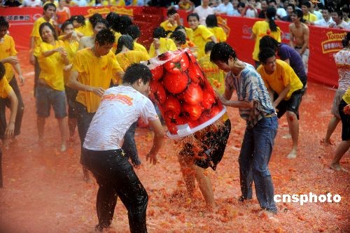 10月19日,一場(chǎng)番茄大戰(zhàn)在廣東省東莞華南MALL狂熱上演。為避免砸傷事故,15噸西紅柿經(jīng)過(guò)專(zhuān)門(mén)的軟化。此次狂歡活動(dòng)吸引了上萬(wàn)人觀看。游客分批進(jìn)入番茄池狂砸,根本不管比賽規(guī)則,不要分?jǐn)?shù),只要開(kāi)心。中新社發(fā) 許康平 攝