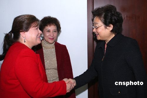 10月20日,由國(guó)務(wù)院僑務(wù)辦公室和中國(guó)海外交流協(xié)會(huì)主辦的首屆國(guó)際禮儀培訓(xùn)班在北京開課。國(guó)務(wù)院僑辦主任李海峰歡迎并會(huì)見授課講師、美國(guó)前政府白宮高級(jí)禮賓官羅拉·埃福德。中新社發(fā) 廖文靜 攝