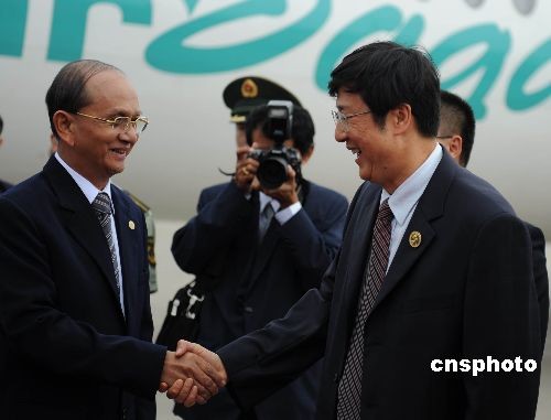 十月二十日,緬甸總理登盛飛抵廣西南寧,出席將于二十二日舉行的第五屆中國—東盟博覽會(huì)。他在南寧國際機(jī)場(chǎng)受到廣西官員的熱烈歡迎。中新社發(fā) 蔣雪林 攝
