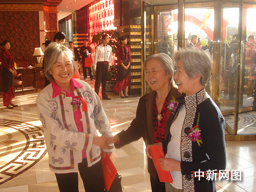 我國首位女子乒乓球世界冠軍邱鐘慧(中)與原毛澤東主席機要秘書張玉鳳(左)出席揭牌儀式。作者:韓凱