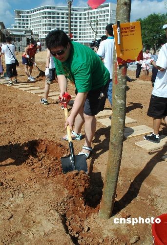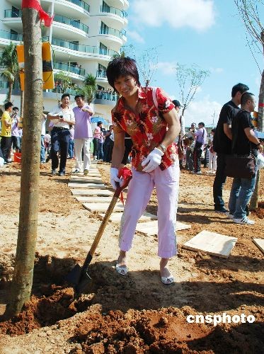 圖為北京奧運會女子柔道52公斤級冠軍冼東妹在種樹。中新社發(fā) 尹海明 攝