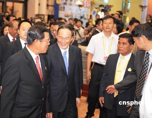 十月二十一日,中國—東盟博覽會主題國柬埔寨館舉行開館儀式。儀式結(jié)束后,洪森、王歧山共同巡視中國—東盟博覽會展館柬埔寨館。中新社發(fā) 蔣雪林 攝
