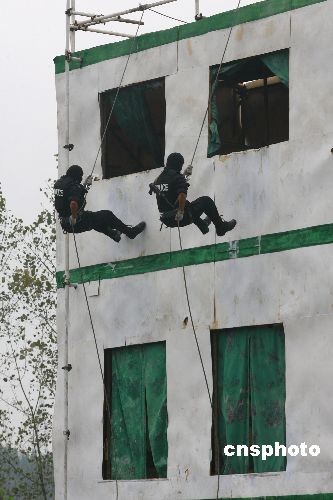 10月21日上午,遂寧市公安特警在進(jìn)行反劫持人質(zhì)演習(xí)。當(dāng)天,四川遂寧市公安大練兵暨反恐演習(xí)舉行。中新社發(fā) 鐘 敏 攝