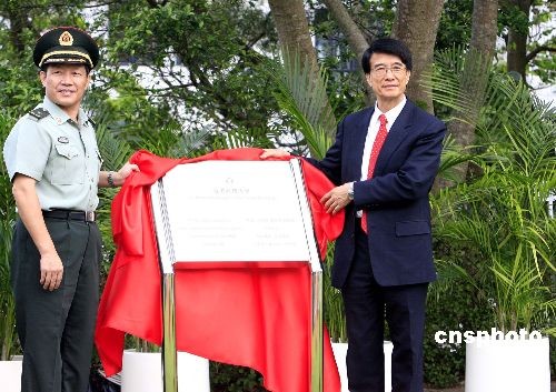 十月二十四日,中國(guó)人民解放軍駐港部隊(duì)八十位官兵訪問香港科技大學(xué)。圖為駐港部隊(duì)副司令董文久與香港科技大學(xué)校長(zhǎng)朱經(jīng)武在科技大學(xué)草坪主持植樹紀(jì)念及牌匾揭幕儀式。中新社發(fā) 張勤 攝