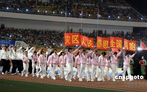 開幕式上,四川代表團(tuán)進(jìn)場(chǎng)時(shí)高舉“災(zāi)區(qū)人民感恩全國(guó)同胞”的橫幅,激起全場(chǎng)熱烈掌聲。中新社發(fā) 王東明 攝